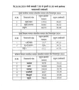 तर याच निवडणूक प्रक्रियेतीलमुंबई पदवीधर मतदार संघासाठी १ वाजेपर्यंत ३८.४०% तर मुंबई शिक्षक मतदार संघासाठी १ वाजेपर्यंत ४०.४८% मतदान पार पडले आहे.