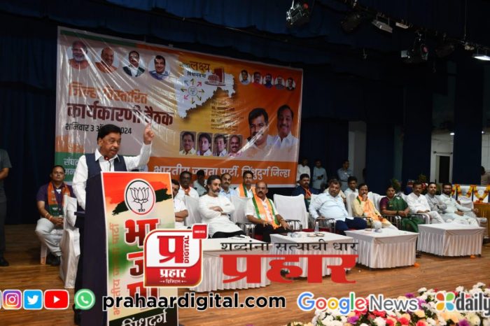 सावंतवाडी येथील बॅरिस्टर नाथ पै सभागृहात आयोजित विस्तारीत जिल्हा कार्यकारीणी बैठकीचे उद्घाटन खासदार नारायण राणे यांच्या हस्ते भाजपचा झेंडा फडकवून तसेच व दीप प्रज्वलनाने झाले. यावेळी उपस्थित पदाधिकारी व कार्यकर्त्यांना मार्गदर्शन करताना ते बोलत होते. यावेळी राज्याचे सार्वजनिक बांधकाम मंत्री तथा पालकमंत्री रविंद्र चव्हाण, भाजपचे प्रदेश सरचिटणीस माजी खासदार निलेश राणे, भाजपचे जिल्हाध्यक्ष प्रभाकर सावंत, सावंतवाडी विधानसभा प्रमुख माजी आमदार राजन तेली, माजी आमदार प्रमोद जठार, महिला जिल्हाध्यक्षा सौ. श्वेता कोरगांवकर, जिल्हा बँक अध्यक्ष मनीष दळवी, जिल्हा उपाध्यक्ष संजू परब, जिल्हा सरचिटणीस महेश सारंग, भाजयुमोचे प्रदेश उपाध्यक्ष युवराज लखमराजे भोंसले, विशाल परब, शहर मंडल अध्यक्ष अजय गोंदावळे, जिल्हा परिषदेचे माजी अध्यक्ष अशोक सावंत, उपाध्यक्ष रणजित देसाई, एकनाथ नाडकर्णी, प्रसन्न देसाई, सुधीर दळवी, दादा साईल, रविंद्र मडगांवकर, पुखराज पुरोहित, प्रमोद रावराणे, राजू राऊळ, मनोज नाईक, आदी उपस्थित होते.