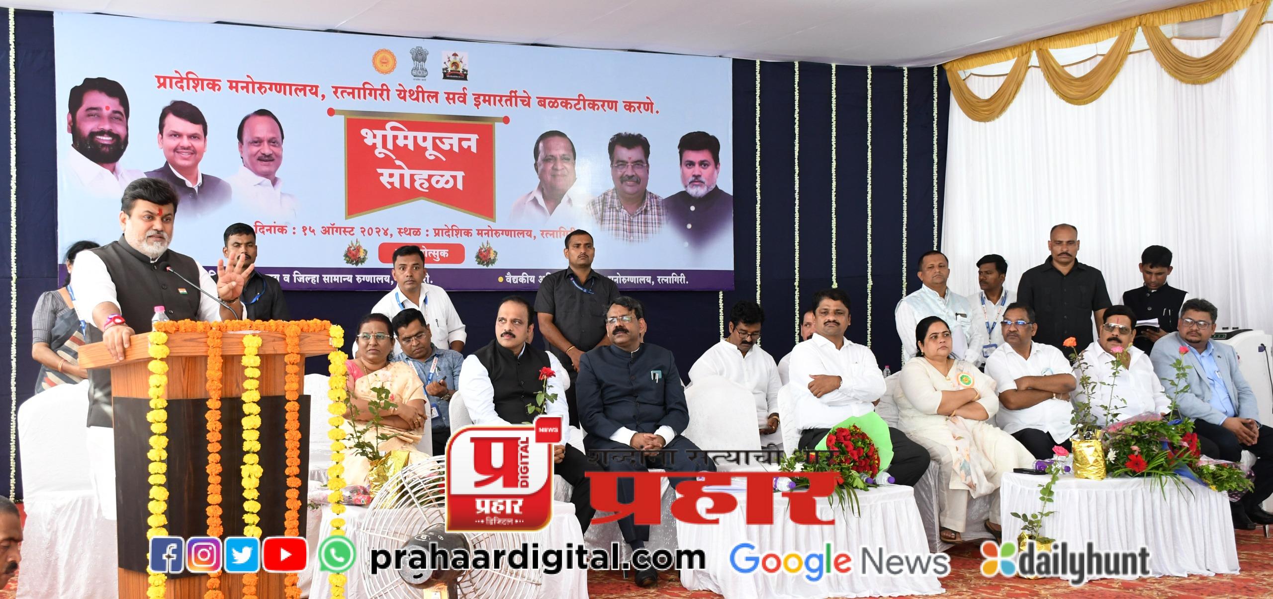 प्रादेशिक मनोरुग्णालयातील इमारतीचे बळकटीकरण भूमिपूजन सोहळा पालकमंत्री श्री. सामंत यांच्या हस्ते कोनशिला अनावरण करुन काल झाला. यावेळी अपर जिल्हाधिकारी शंकर बर्गे, शासकीय वैद्यकीय महाविद्यालयाचे वैद्यकीय अधिष्ठाता डॉ. जयप्रकाश रामानंद, वैद्यकीय अधीक्षक डॉ. संघमित्रा फुले, जिल्हा शल्य चिकित्सक डॉ. भास्कर जगताप, मनोविकृती तज्ज्ञ डॉ. संजय कलकुटगी, विजय खेडेकर, बिपीन बंदरकर, सुदेश मयेकर, बाबू म्हाप आदी उपस्थित होते.
