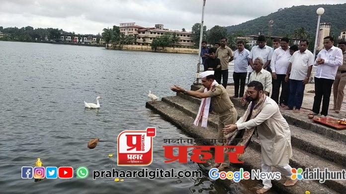 सावंतवाडी । प्रतिनिधी : नारळी पौर्णिमेला अर्पण करण्यात येणारा ‘मानाचा सुवर्ण नारळ ‘ ऐतिहासिक मोती तलावात अर्पण करण्यात आला. युवराज लखमराजे भोंसले व पोलिस निरीक्षक अमोल चव्हाण यांच्या उपस्थितीत हा नारळ तलावात अर्पण केला. सोमवारी घडलेल्या घटनेच्या पार्श्वभूमीवर यंदा दुसऱ्या दिवशी हा सोहळा संपन्न झाला.