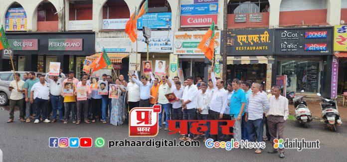 सावंतवाडी । प्रतिनिधी : देशाचे पंतप्रधान नरेंद्र मोदी यांनी मालवण येथील छत्रपती शिवाजी महाराजांचा पुतळा दुर्घटने प्रकरणी माफी मागितली असताना देखील विरोधकांकडून सुरू असलेल्या राजकारणाचा भाजपच्या माध्यमातून निषेध करण्यात आला. महाविकास आघाडीच्या नेत्यांचे फोटो झळकावत निषेधाच्या घोषणा देण्यात आल्या.