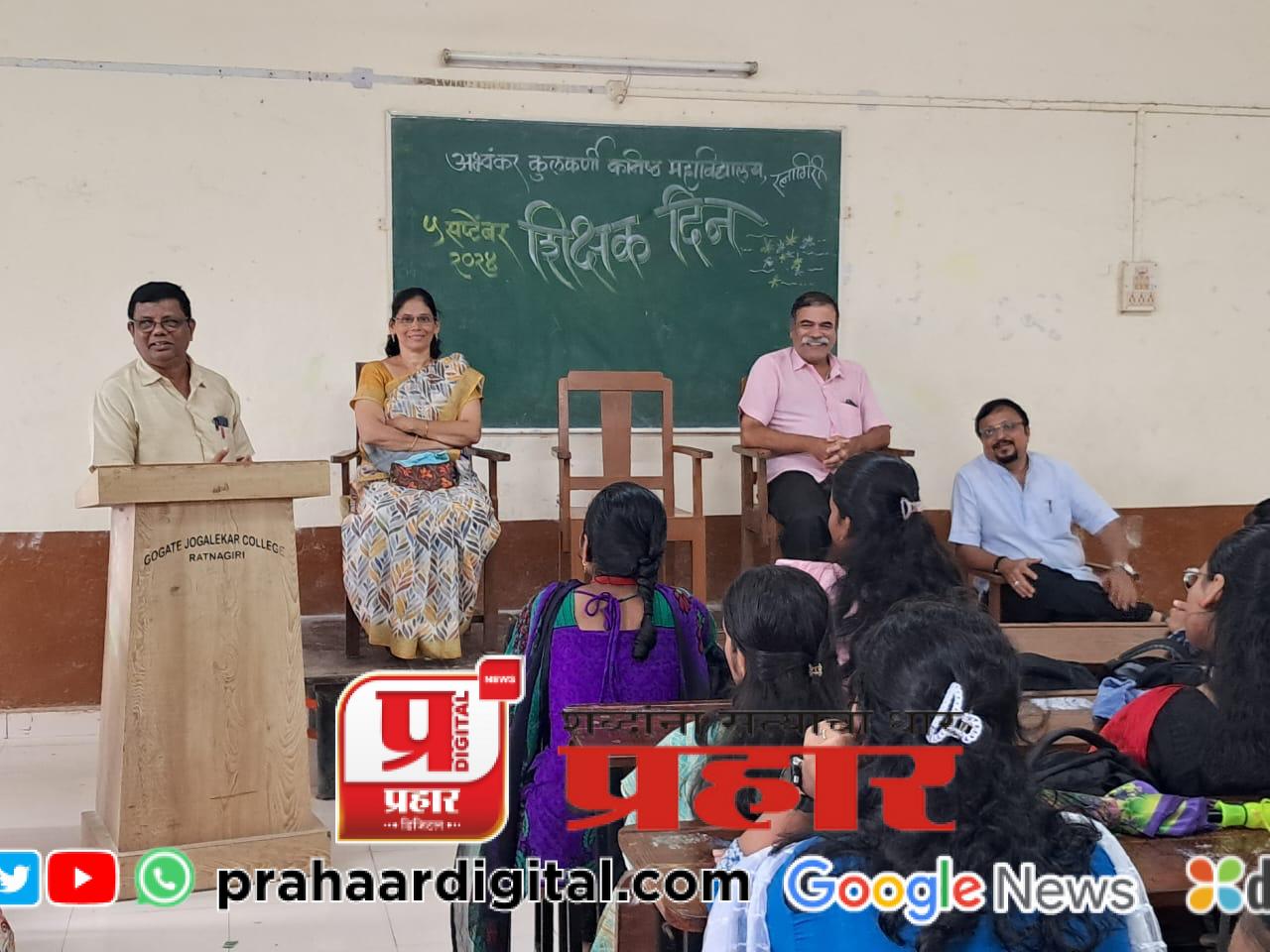 रत्नागिरी एज्युकेशन सोसायटीच्या अभ्यंकर कुलकर्णी कनिष्ठ महाविद्यालयात शिक्षक दिन अतिशय उत्साहात साजरा करण्यात आला. याप्रसंगी आयोजित केलेल्या कार्यक्रमात दिनविशेष समितीच्या प्रमुख सौ. विस्मया कुलकर्णी यांनी आपले विचार मांडले, डॉ. सर्वपल्ली राधाकृष्णन यांच्या कार्याची माहिती विद्यार्थ्यांना दिली आणि शिक्षकांचे आपल्या जीवनातील महत्व स्पष्ट केले.