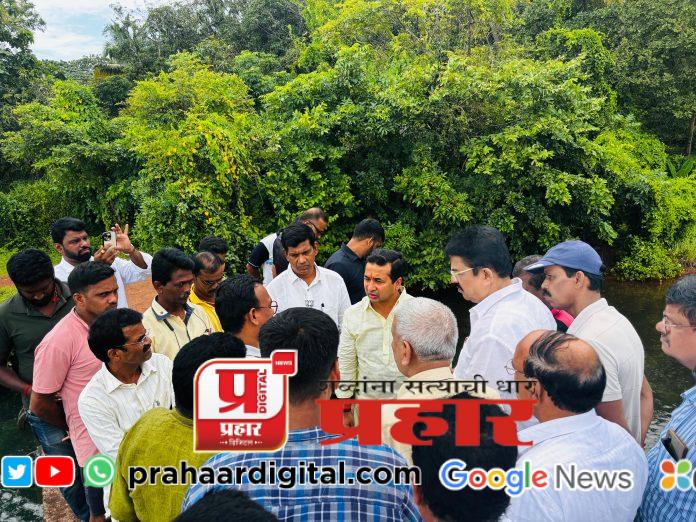 भटवाडी येथील खार बंधाऱ्याच्या नादुरुस्त असलेल्या मोऱ्या व झडपे दुरुस्त करू असे आश्वासन आमदार नितेश राणे यांनी दिले आमदार नितेश राणे यांनी आज देवगड दौऱ्यामध्ये या बंधाऱ्याची पाहणी केली.