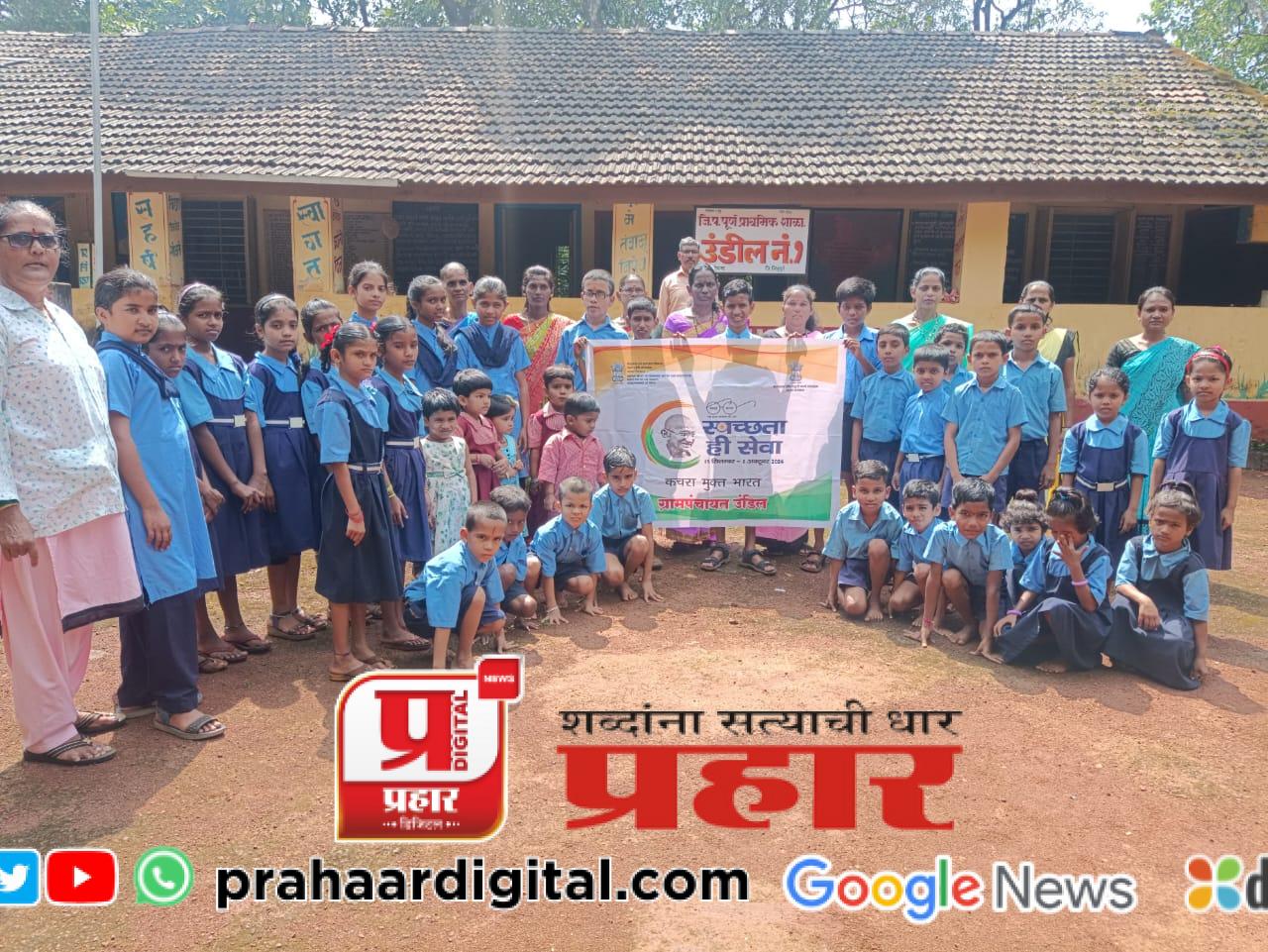 आचरा–अर्जुन बापर्डेकर :उंडील ता.देवगड प्राथमिक शाळा नं1 येथे महात्मा गांधी जयंती निमित्त स्वच्छता ही सेवा, कचरा मुक्त भारत संदेश देत विद्यार्थ्यांनी जि.प.शाळा उंडील नं.1 ते वैश्यवाणी समाज मठ उंडील पर्यंत स्वच्छता फेरी काढून जागृती केली.यावेळी उंडील सरपंच उज्वला यादव,उपसरपंच जयेश नर,पोलीस पाटील जयंती नर,मुख्याध्यापक ज्योती शेरुलकर