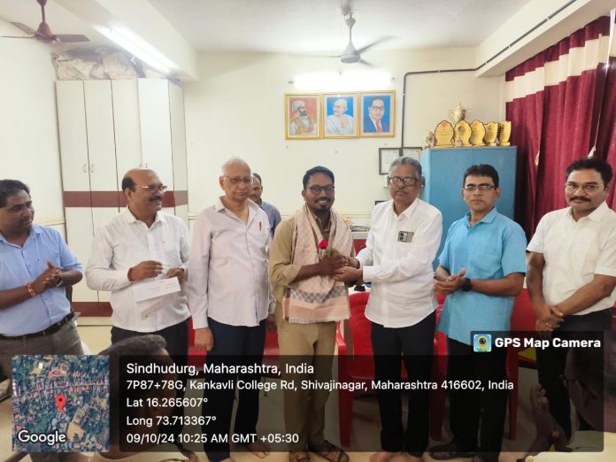 कणकवली :मुरकर गुरूजी चॅरिटेबल ट्रस्टच्या वतीने कणकवली पोस्ट कार्यालयांमध्ये जागतिक टपाल डे निमित्त पोस्टमन यांचा शाल श्रीफळ व गुलाब पुष्प देऊन सत्कार करण्यात आले. यावेळी व्यासपीठावर मुरकर गुरूजी चॅरिटेबल ट्रस्टचे अध्यक्ष प्रा दिवाकर मुरकर, कार्यक्रमाचे प्रमुख पाहुणे कणकवली शिक्षण प्रसारक मंडळाचे सचिव मा विजय वळंजू , कणकवली पोस्ट कार्यालयाचे पोस्टमास्तर गिरीश कामत, सहायक पोस्टमास्तर अशोक गावडे, शैक्षणिक मंडळाचे चेअरमन अच्युतराव वणवे, मंडळाचे सहसचिव प्रा विजय सावंत, जेष्ठ सदस्य निवृत्त माजी मुख्याध्यापक विजय पारकर पोस्ट कार्यालयातील अधिकारी व कर्मचारी उपस्थित होते.