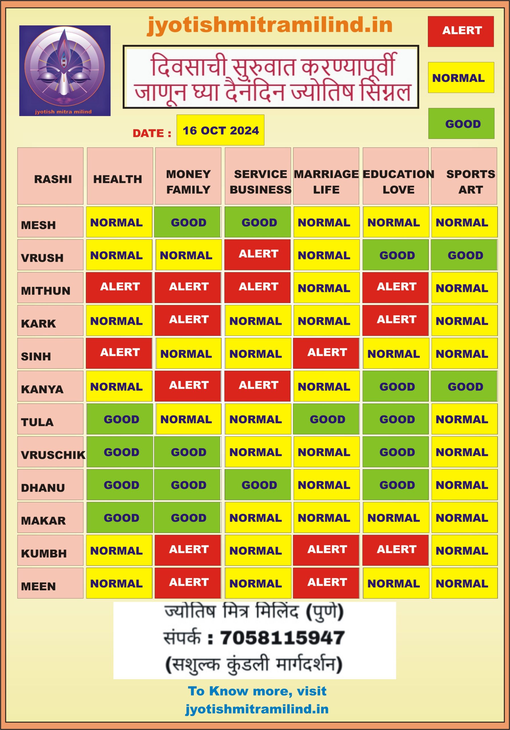 आजचा दिवस व्यस्त राहील. नोकरीत चांगली प्रगती होईल, संघात काम करण्याची संधी मिळेल. आर्थिक स्थिती उत्तम राहील, आर्थिक व्यवस्थापन करा. कौटुंबिक जीवनात आनंद वाढेल. विद्यार्थ्यांना थोडा ताण येईल, पण यश मिळेल. महत्त्वाच्या कामांना आजच करा. आरोग्याच्या बाबतीत सावध रहा. संततीकडून चांगले कामे होतील. वयोवृद्धांचे आरोग्य सामान्य राहील. अध्यात्मिक विचारांमध्ये सुसंगतता असेल. खरेदीसाठी योग्य वेळ, शुभ रंग हिरवा, शुभांक ६.