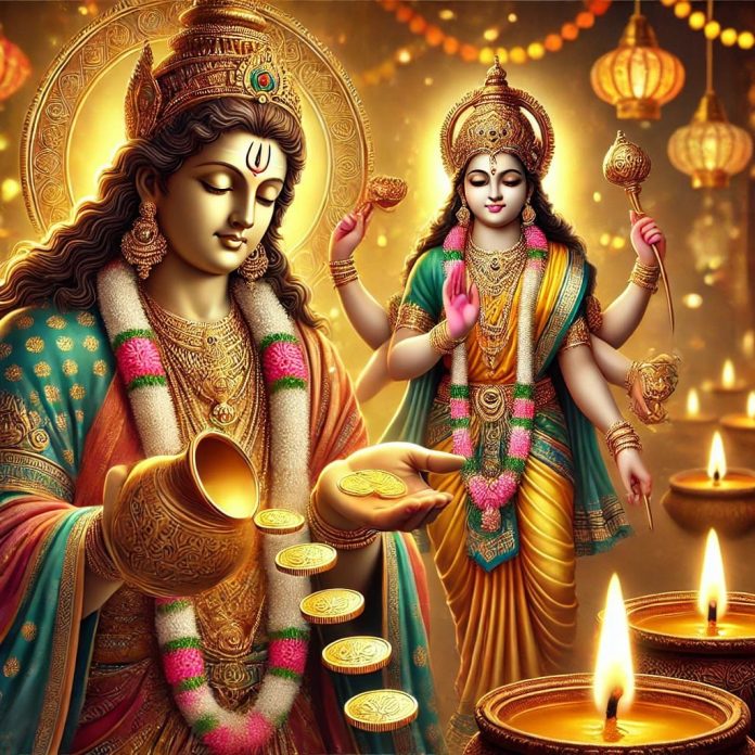 4. कुबेर व लक्ष्मी माता यांची मूर्ती ठेवा: एक चौरंग किंवा पाटावर लक्ष्मी माता आणि कुबेर देव यांच्या प्रतिमा ठेवा. त्यासमोर एक तांब्याचा कलश ठेवावा.