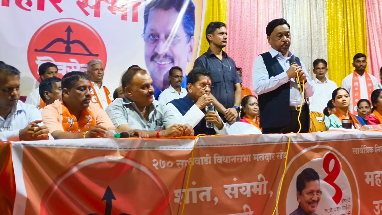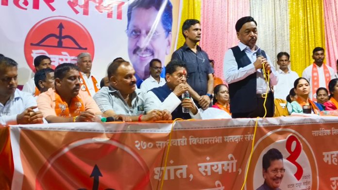महायुतीचे उमेदवार दीपक केसरकर यांच्या प्रचारार्थ पिंपळेश्वर हॉल येथे प्रचार सभा संपन्न झाली. यावेळी उपस्थितांना संबोधित करताना खा. नारायण राणे बोलत होते. व्यासपीठावर उमेदवार दीपक केसरकर, महिला जिल्हाध्यक्ष श्वेता कोरगावकर, माजी जि. प. उपाध्यक्ष राजेंद्र म्हापसेकर, शिवसेना उपजिल्हाप्रमुख राजेंद्र निंबाळकर, तालुकाप्रमुख गणेशप्रसाद गवस, महिला जिल्हाप्रमुख नीता सावंत कविटकर, भाजपा तालुकाध्यक्ष सुधीर दळवी, नगराध्यक्ष चेतन चव्हाण, नगरसेवक संतोष नानचे, नगरसेविका संध्या प्रसादी, सोनाली केसरकर, राष्ट्रवादी तालुकाध्यक्ष सत्यवान गवस, भाजपा पक्ष निरीक्षक दत्ता नाईक रेडकर, संदीप कुडतरकर, दीक्षा महालकर, नितीन मणेरीकर, राजेश प्रसादी, विश्वासराव देसाई उपस्थित होते.